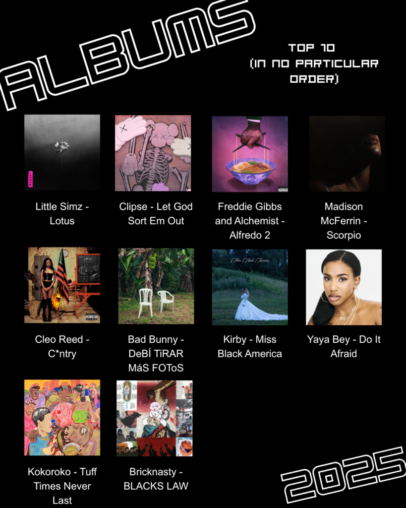 The top 10 list represents a masterclass in versatility and creative evolution. Little Simz continued her reign with the introspective Lotus, while the long-awaited return of Clipse on Let God Sort Em Out brought a grit that only siblings can master. We saw high-concept releases like Cleo Reed’s C*ntry, which brilliantly deconstructed the Black femme experience through folk-electronic landscapes, alongside the smooth, soul-inflected heartbreak of Madison McFerrin. To be honest, in a time where I only talked about hip-hop, my top 10 consisted mainly of R&B, with it was the soul-stirring melodies of Kirby and Yaya Bey standing up for the genre.