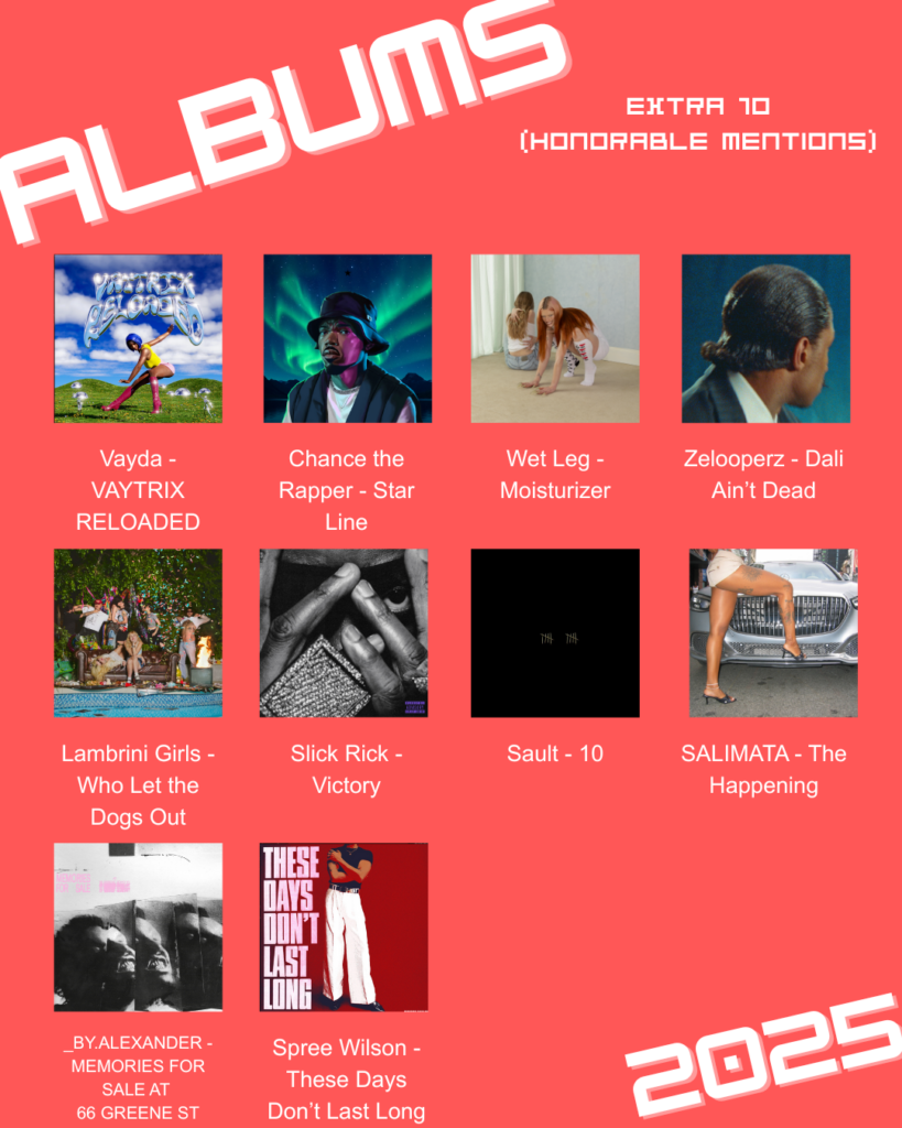 My honorable mentions, the “Extra 10,” further prove that 2025 was a year of incredible depth. Rap saw the return of Slick Rick and Chance the Rapper, while the genre expanded it’s boundaries with newcomers Vayda and Zelooperz. As always, the UK brought the heat with the punk energy of Lambrini Girls and wet-leg, and the always amazing Sault.